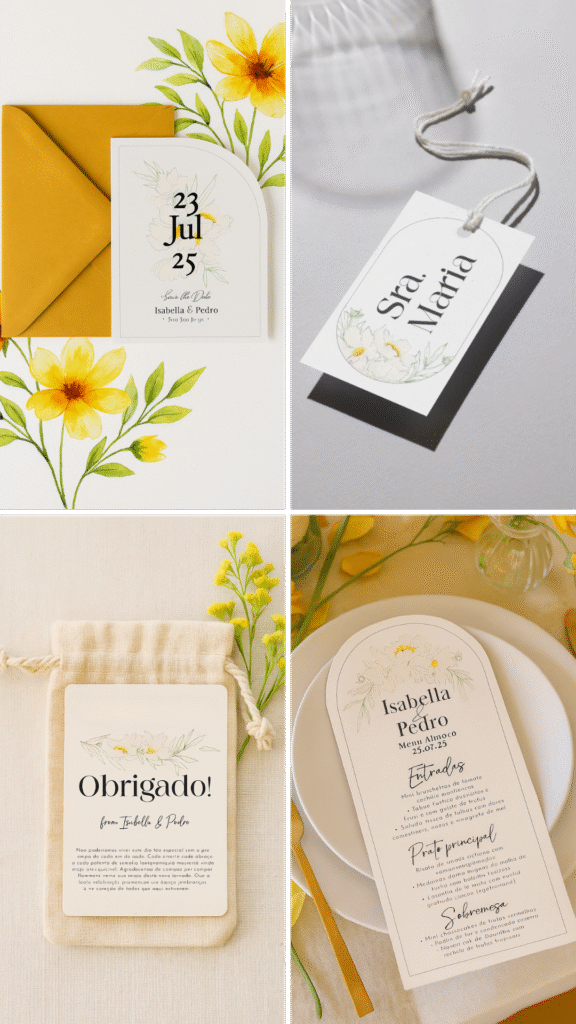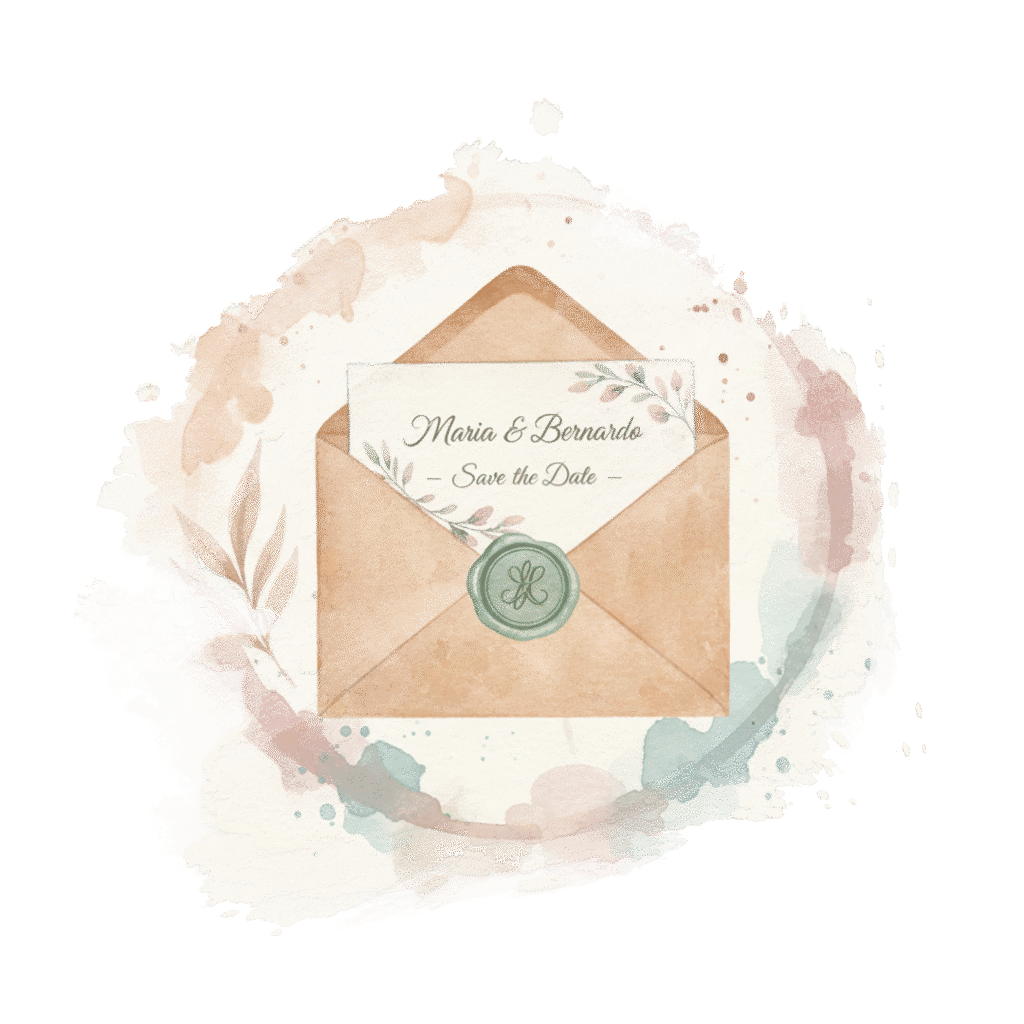 O prazo varia conforme o pacote e a complexidade. Em média, o processo de criação, aprovação e entrega das artes digitais leva de 4 a 6 semanas. Sugerimos iniciar o contato de 6 a 12 meses antes do casamento, especialmente se incluir um site personalizado.